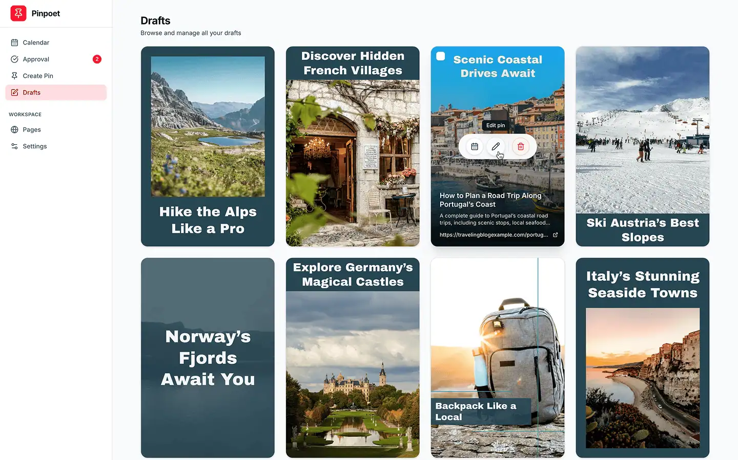 Turn every page into multiple pins automatically. Pinpoet generates content, schedules posts, and tracks performance. Set it and forget it.